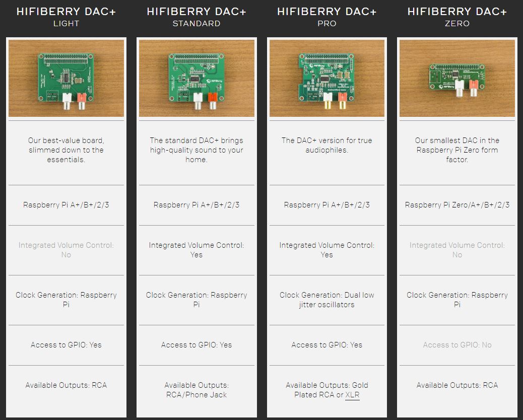 HiFiBerry 제품 비교표