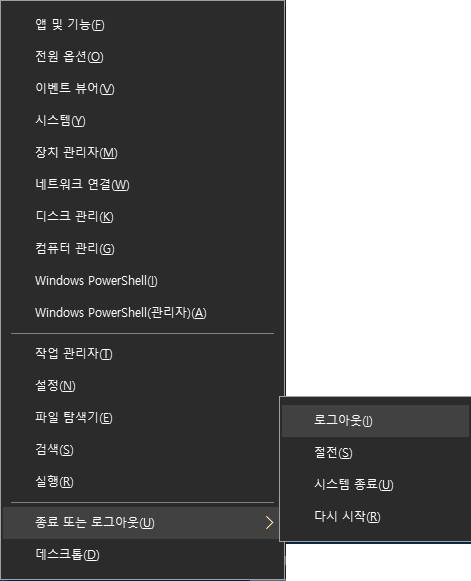 - 사용예 : 시스템 종료 = Win + X -> U -> U