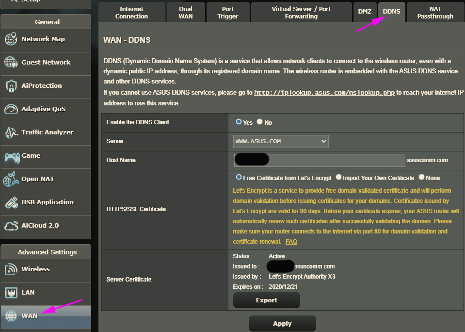 메인 메뉴 -> WAN -> DDNS