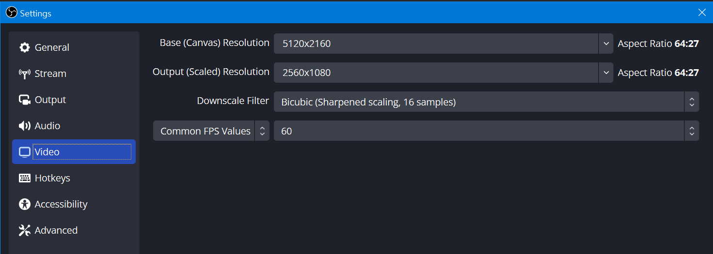 Output (Scaled) Resolution : 저장할 비디오 해상도로 설정