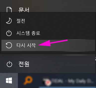(좌하단) 시작 메뉴 -> 전원 -> "다시 시작" 메뉴를 Shift키를 누른 상태에서 클릭
