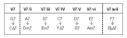 - 예)  C 키에서 G 코드의 세컨더리 도미넌트는 E7 코드