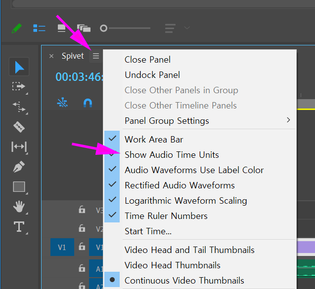 TimeLine 패널 좌상단 메뉴 -> Show Audio Time Units 체크