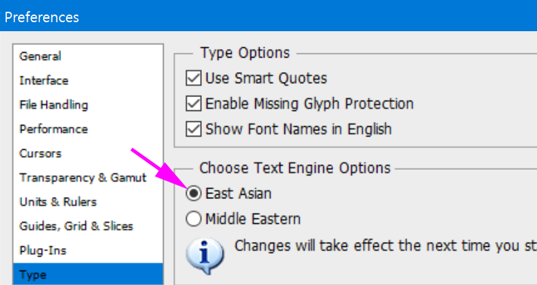 메뉴에서 Edit(편집) -> Preferences(환경 설정) -> Type(문자)