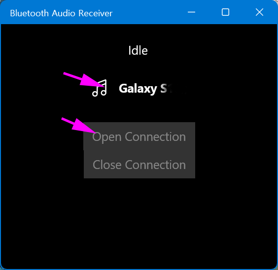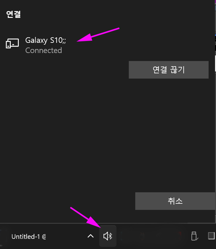 트레이 아이콘 클릭 -> 기기 선택 하면 연결됨(휴대폰에서는 블루투스 기능 켜고 기다림)