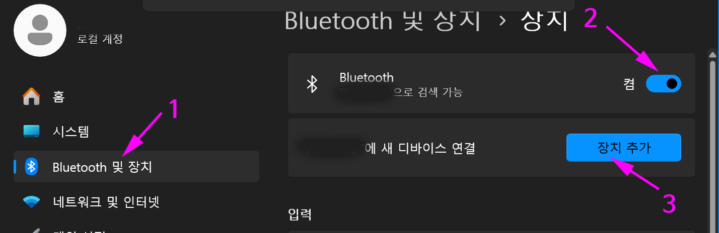 윈도우 설정 -> Bluetooth 및 장치 -> Bluetooth : 켬 설정