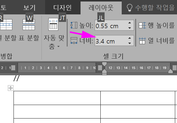 주의! 너비에 숫자가 없는 상태에서 입력란의 상하 버튼을 클릭하면 표가 비정상적으로 변할 수도 있음