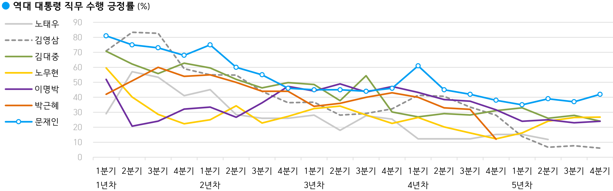 역대 대통령 직무 수행 긍정률 (%)