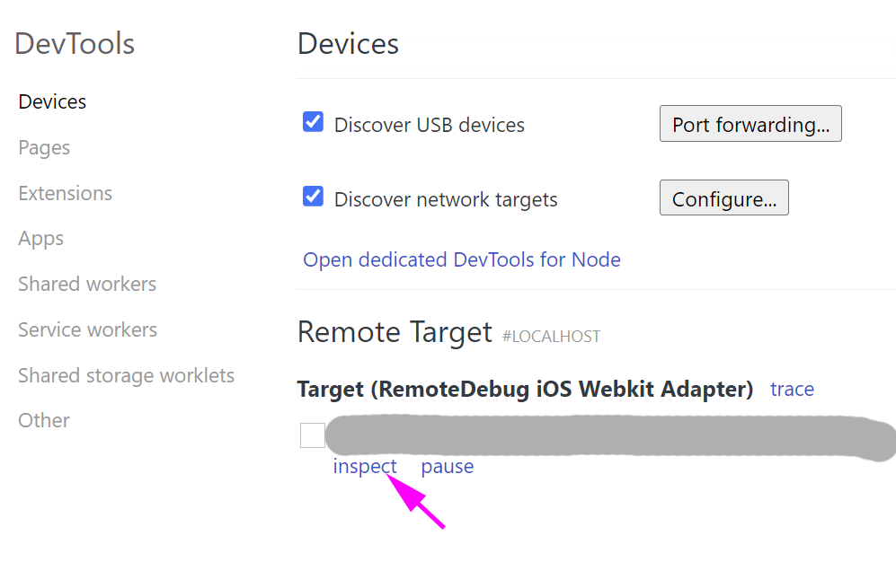 chrome://inspect를 연 창에 현재창의 콘솔 메지지가 출력됨