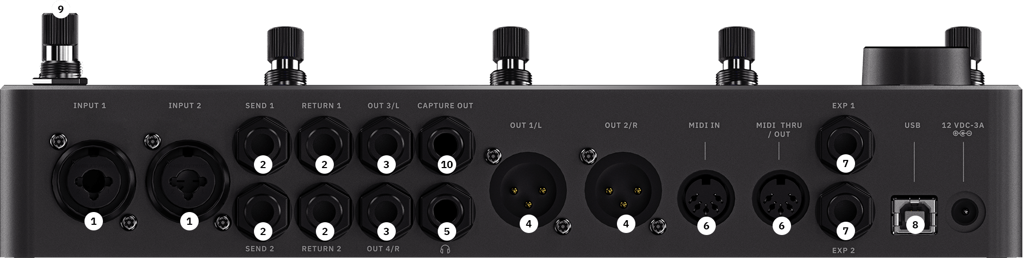 | 1/4" Exp Pedal Inputs | EXP 2, EXP 3 | EXP 2 (shared w/ Footswitch 7/8) | EXP 1, EXP 2 (shared w/ Amp Control 1/2) |
