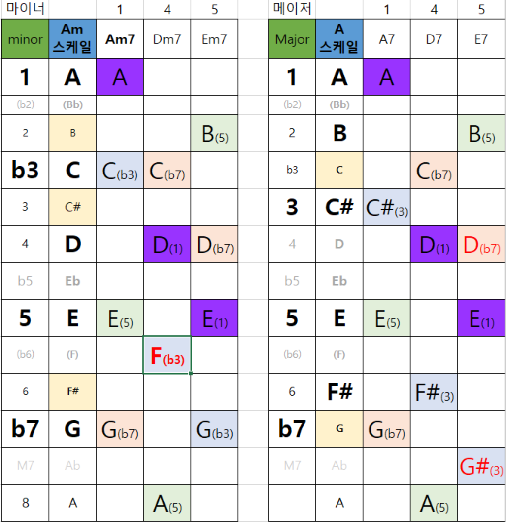 - 메이저에서 보면 4도(D), b7(G) 추가, [ 2도(B)를 추가하는 경우도 있음 ]