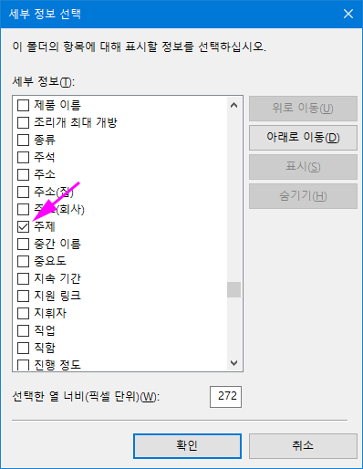 -> 상단 칼럼을 우클릭해서 '주제(Subject)' 항목 추가