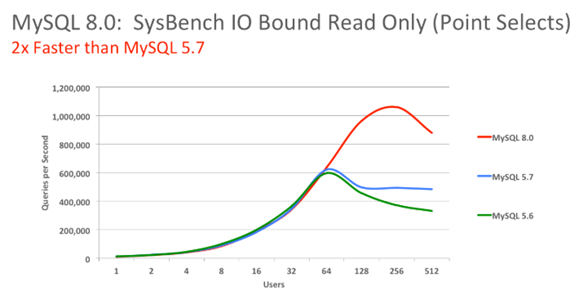 MySQL 8.0은 MySQL 5.7보다 최대 2배 빠릅니다. MySQL 8.0은 Read/Write workload, IO bound workload 및 높은 경합 "hot spot" 작업 부하에 대해 보다 우수한 성능을 제공합니다.
