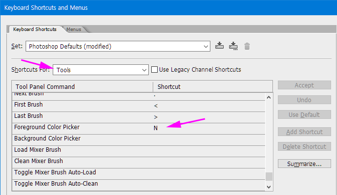 Color Picker (Set Foreground color ) 단축키 지정 방법