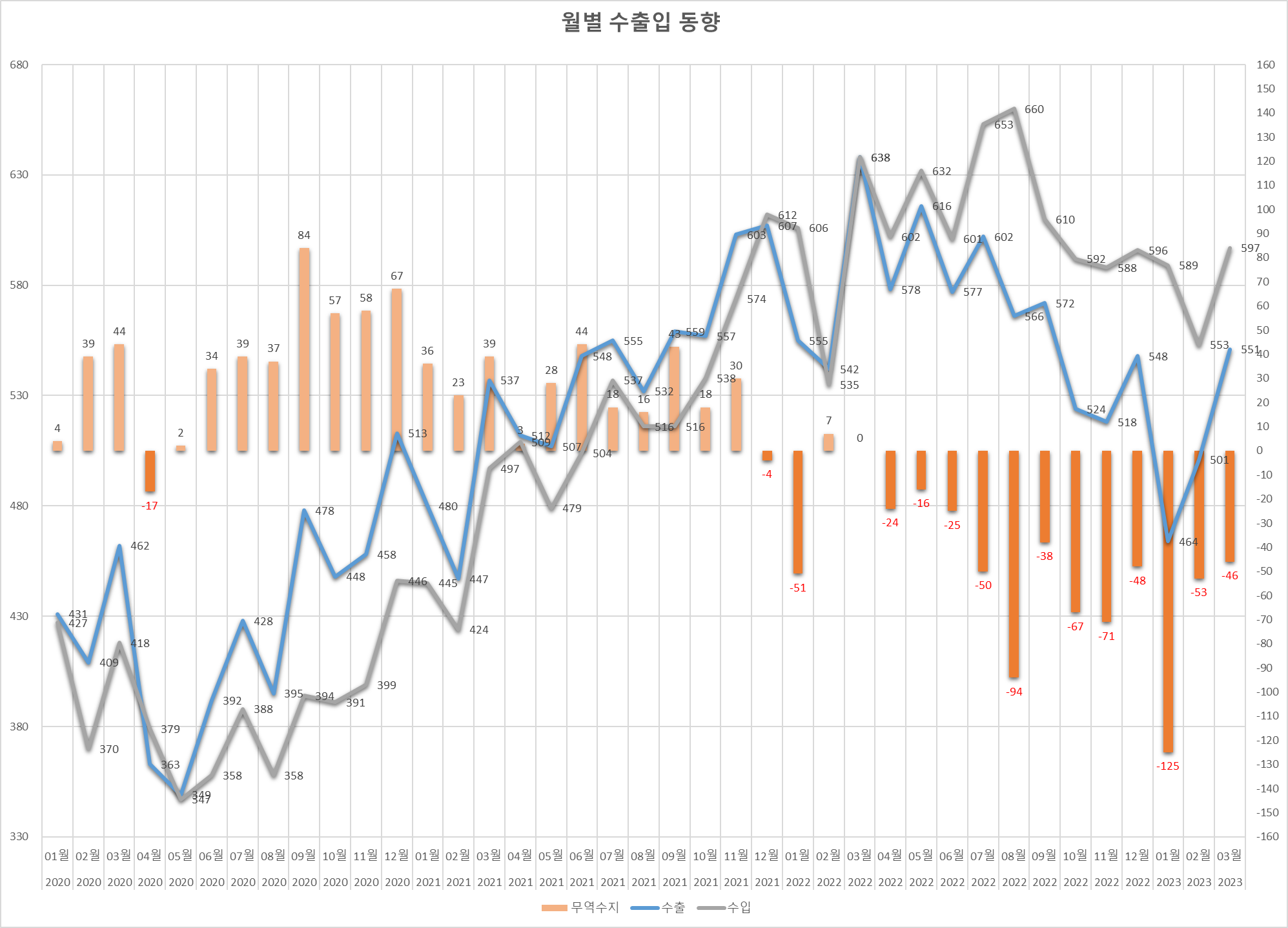 // 월별 수출입 동향 (2020-01 ~ 2023-03)