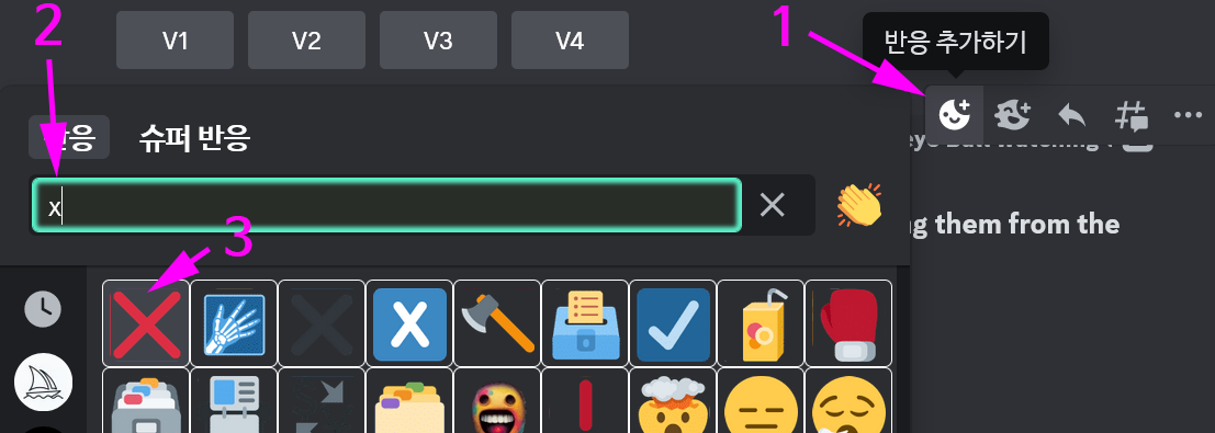 -> 반응추가하기(Add Reaction) -> 'X' 입력 후 선택